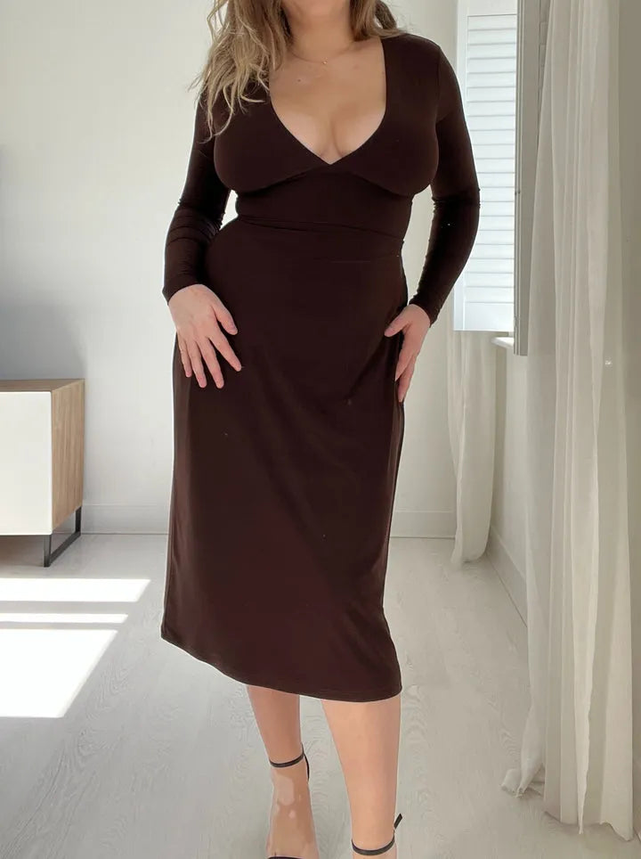 【Casual and Elegant】Long sleeve dress for women, midi dress, v neck, casual solid color, high waist, slim fit, ruched. It is a versatile midi dress, you can match it with a suit jacket,coat,scarf or boots and leggings for a flattering Autumn&Winter Look.