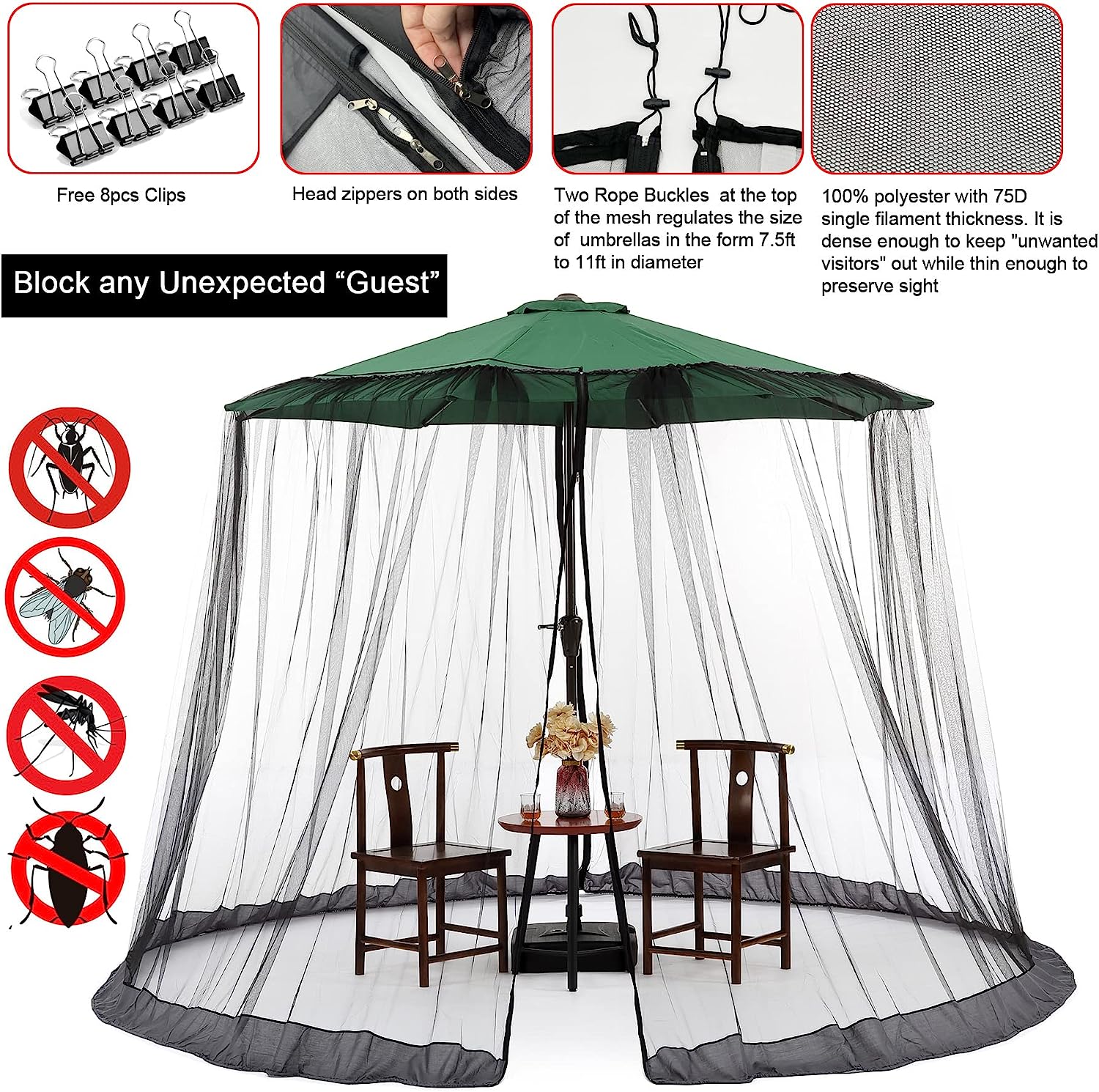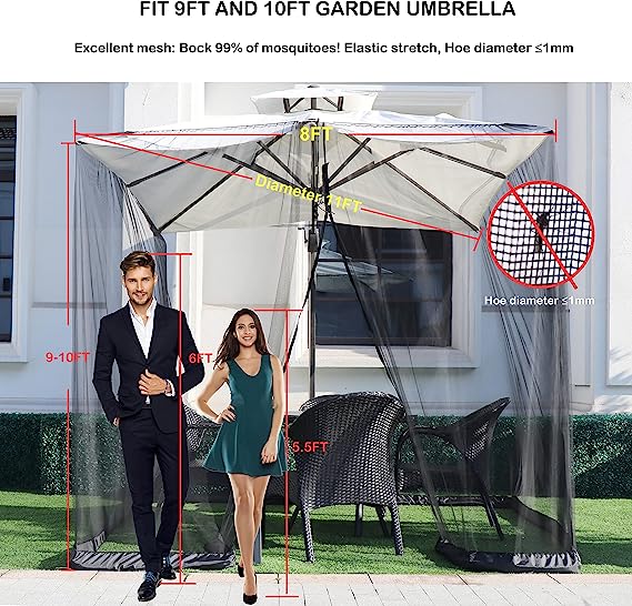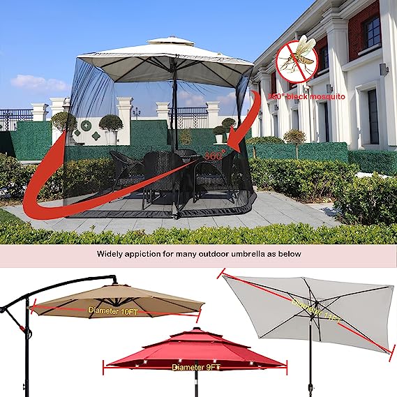 - ☀PROTECTION FROM UNEXPECTED GUESTS: Excellent mesh: Stretchable high quality and high strength polyester netting.Bock 99% of mosquitoes! Elastic stretch, Hoe diameter ≤1mm. This patio umbrella netting screen mosquito mesh umbrella cover provides natural protection from pesky unwanted visitors. This pop up canopy with netting screen is highly useful for hosting parties, dining out on a patio, or for children and pets to rest without fear of unwanted visitor bites!