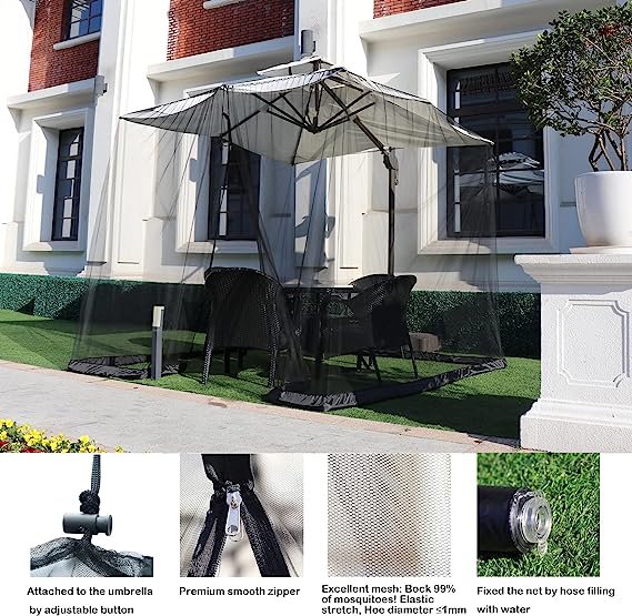 - ☀ HIGH-QUALITY MATERIAL: This umbrella screen netting is made with a thin, breathable high quality 100% polyester netting to ensure longtime utility with a 75D mono filament thickness. umbrella netting features weather resistance. And the umbrella mosquito netting bottom edge has a TPU water pipe, thickness 17 silk. Umbrella mosquito netting 15f is dense enough to keep the unwanted visitors out while thin enough to preserve your view.