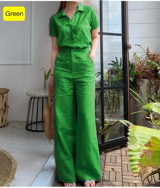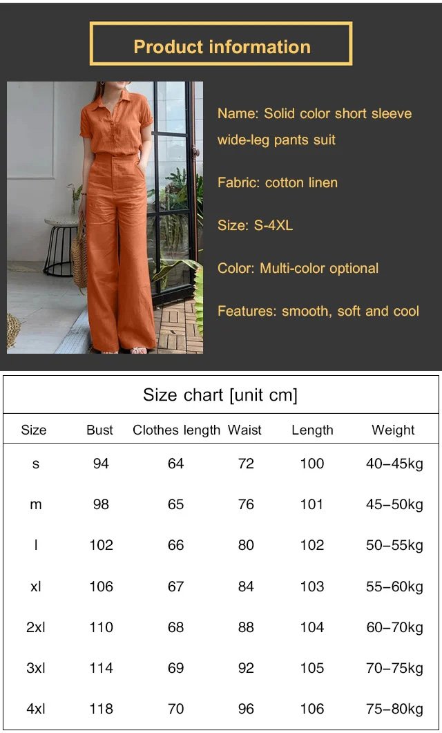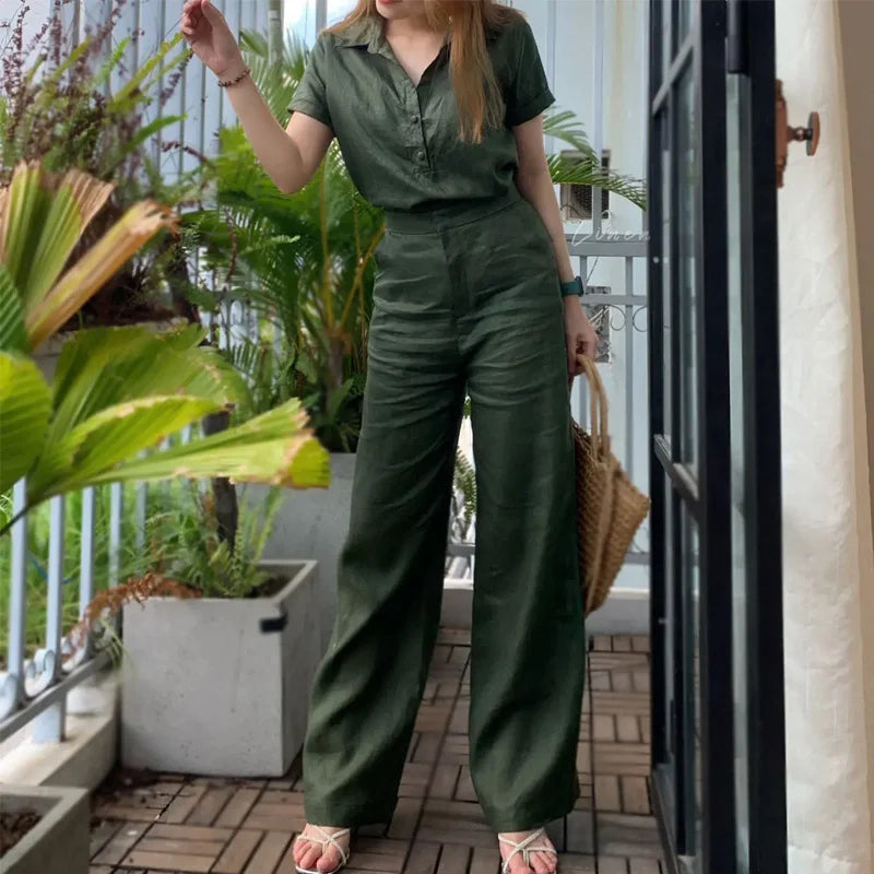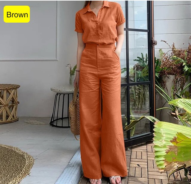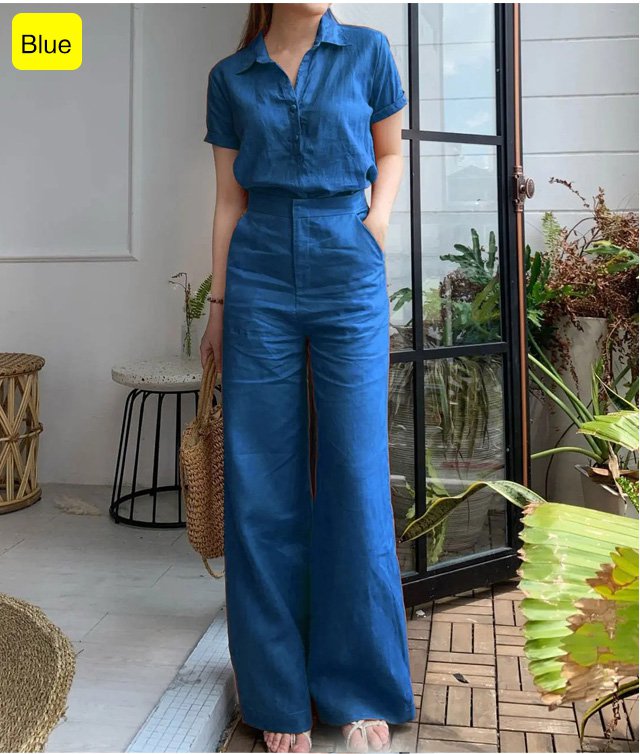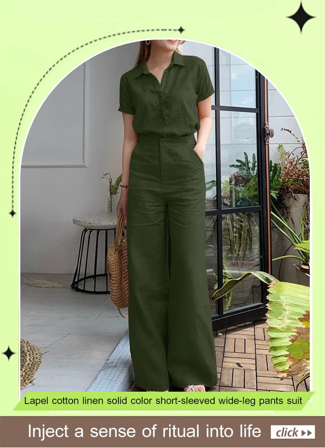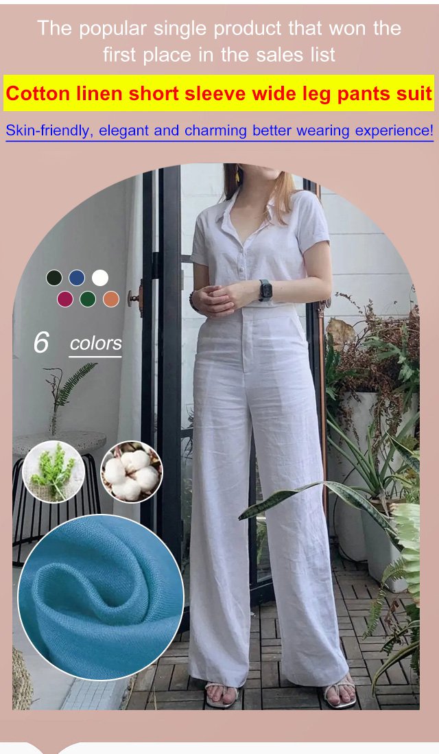 Lapel Cotton Linen Solid Color Short Sleeve Wide Leg Pants 2-piece Set