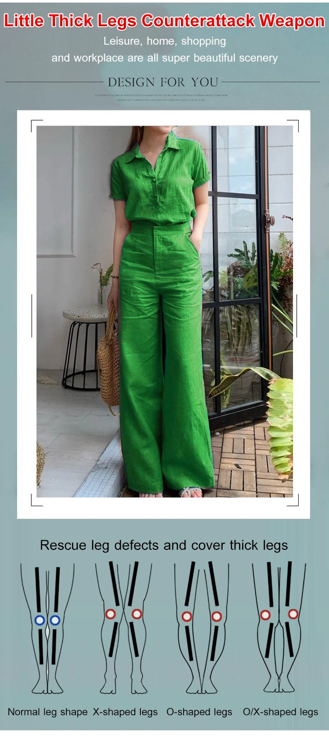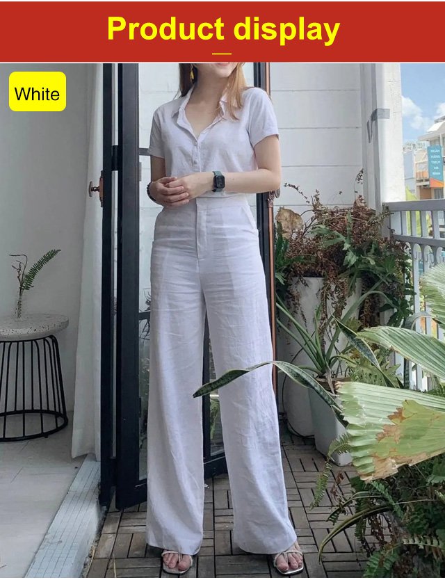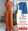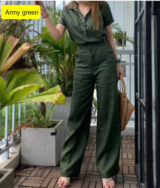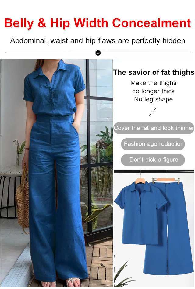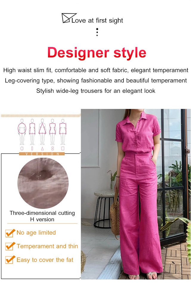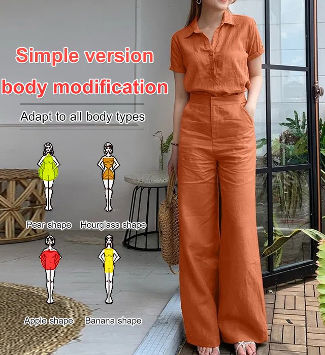 Lapel Cotton Linen Solid Color Short Sleeve Wide Leg Pants 2-piece Set